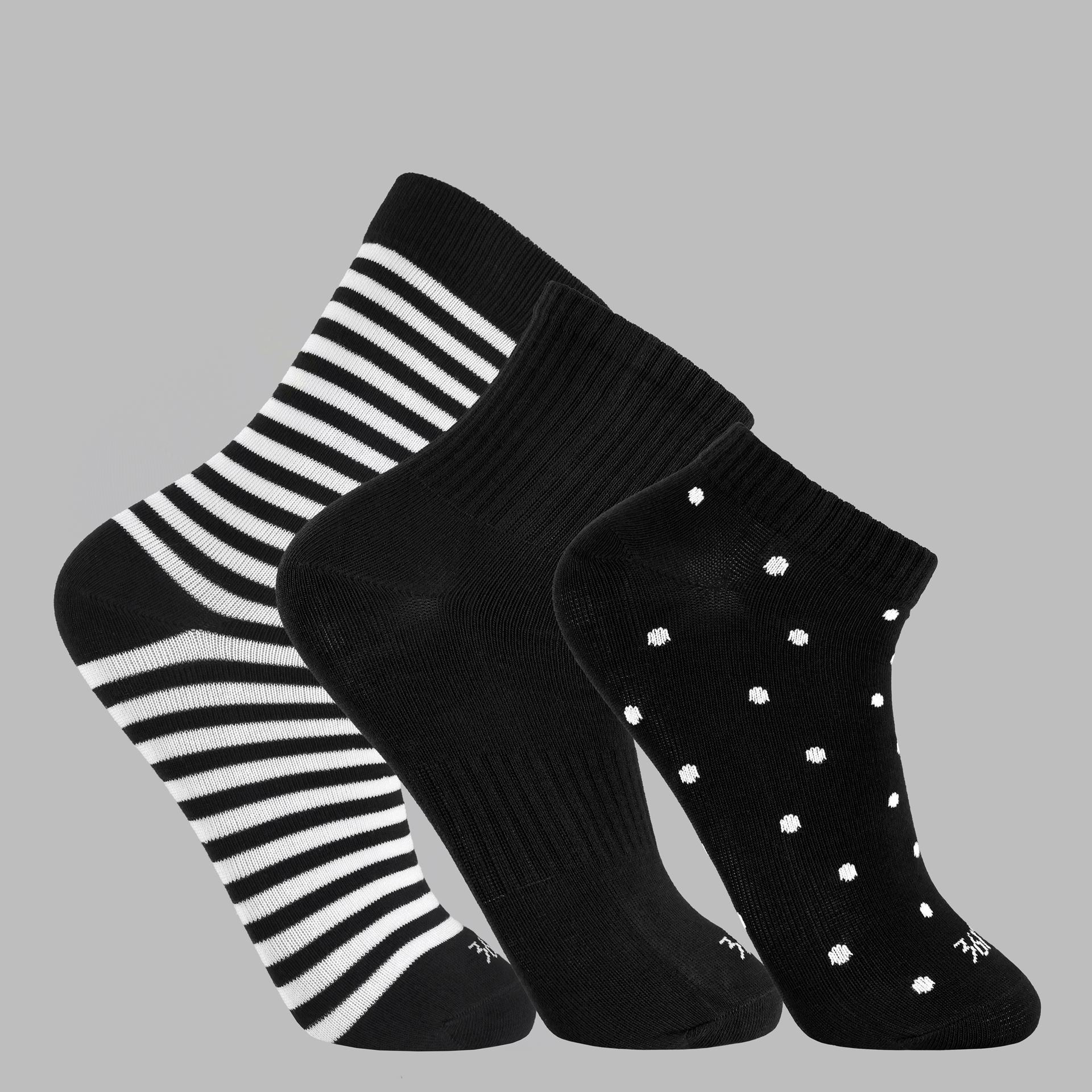 پک جوراب زنانه 361 درجه مدل W512343028-1 شامل سه جفت جوراب با طراحی متنوع و کاربردی است که برای استفاده روزمره و استایلهای مختلف انتخابی ایدهآل محسوب میشود. این پک ترکیبی از جوراب مچی، نیم ساق و ساق بلند با رنگبندی کلاسیک مشکی و مشکی-سفید است.